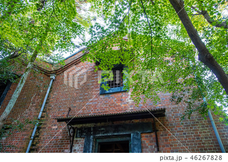 秋の諸戸氏庭園の入口 レンガ造りの蔵(三重県桑名市)