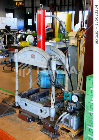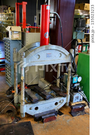油圧ポンプに加圧された作動油の力でシリンダーを動かし強い力を発する… 整備工場の『油圧プレス』