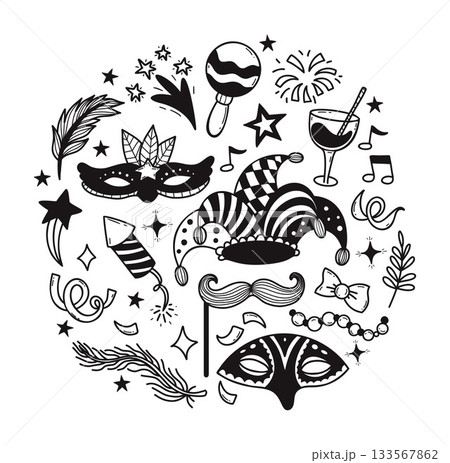 Carnival Celebration Doodle. Theatrical, Party, Masquerade masks, music notes and Festive decorations. Isolated Hand-drawn scribble icons. Vector Illustration for holiday design themes. Not AI