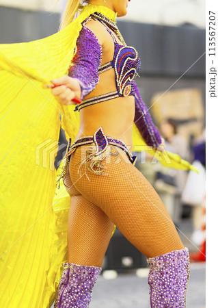 街中の通りでサンバを踊るブラジルの人たちの衣装