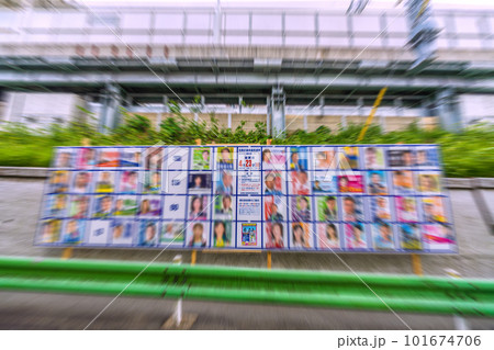 日本の東京都市景観 多摩川駅(東口)前の東京都知事選挙。選挙ポスター掲示場・2024年7月7日投票日