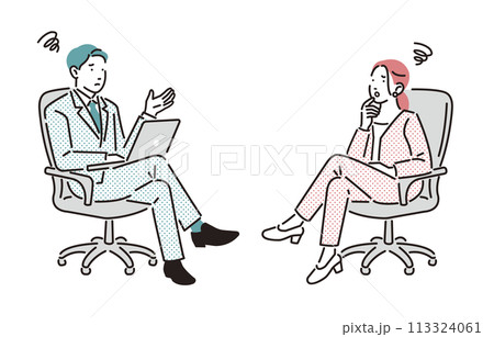 人物 椅子に座って会話をするビジネスパーソンの男女ネガティブイメージ