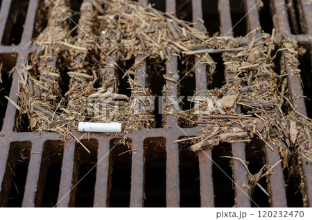 ポイ捨てされたタバコが溜桝のグレーチング上まで流され留まっている風景