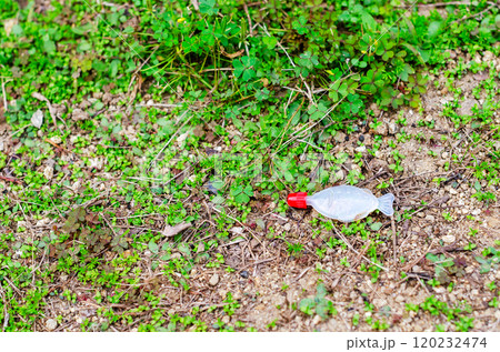 公園内にポイ捨てされた魚を模った弁当用醤油差しが落ちている風景