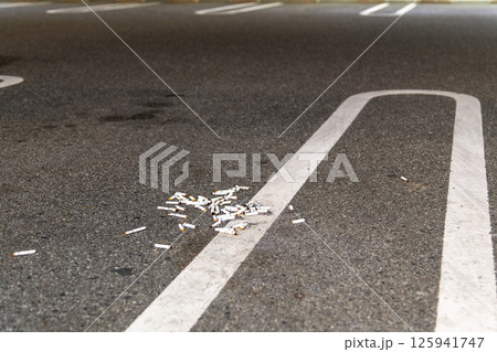 車の灰皿から直接不法投棄され駐車場に取り残されたタバコの吸い殻