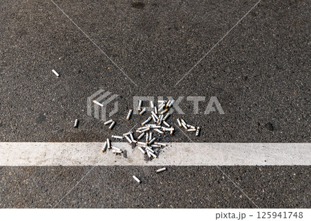 車道と歩道の境界線にポイ捨てされてタバコのある風景