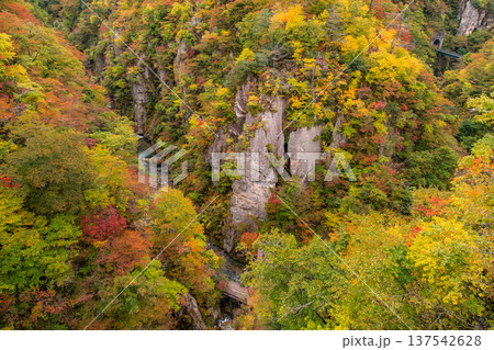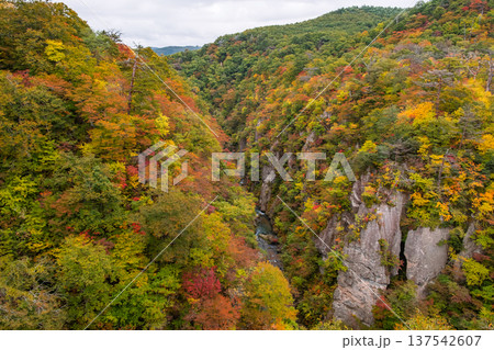 宮城県大崎市 大深沢橋から見下ろす色づき始めた鳴子峡のV字谷と大自然