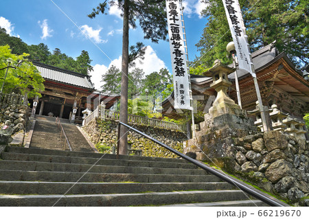 岐阜県揖斐川町 新緑の谷汲山華厳寺灯籠の立ち並ぶ参道にある百度石