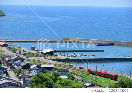 日本海ひすいライン「谷浜周辺を走る雪月花と市街地風景」