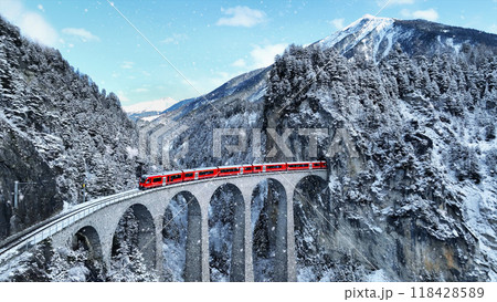 Snow falling and Train passing through famous mountain in Filisur, Switzerland. Train express in Swiss Alps snow winter scenery.
