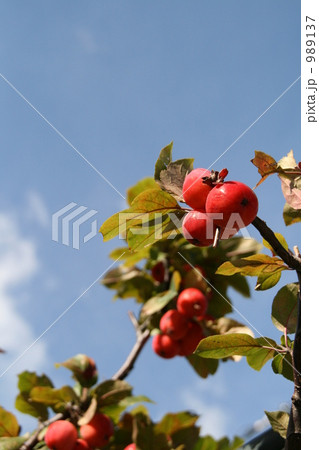 秋の空と真っ赤な豆リンゴ