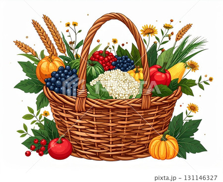 Abundant Harvest Basket Filled with Colorful Fruits and Vegetables Displayed Against White Background