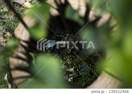 Tiny Duckweed Floating in Lotus Basin, The still water mirrors the sky as clusters of tiny duckweed create a soft green pattern within the lotus basin.
