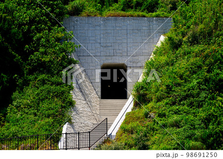 四国・愛媛・佐田岬・御籠島・記念事業として整備された洞窟式砲台跡に入るトンネルの眺め・愛媛県伊方町