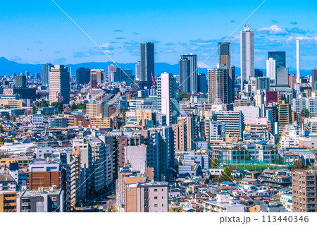 日本の東京都市景観 山々が見える珍景…池袋副都心。サンシャイン60やタワーマンションなどを望む