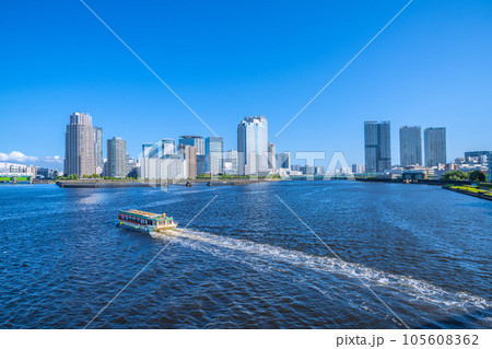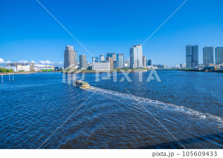 日本の東京都市景観 相生橋から豊洲や屋形船などを望む