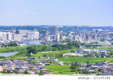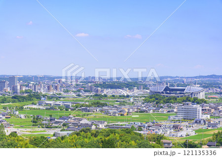 夕暮れの豊田スタジアムと豊田大橋を望む市街地風景