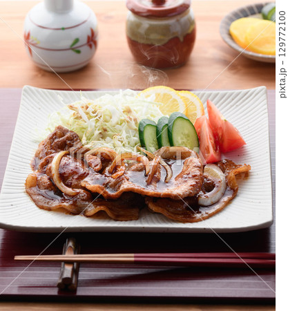 出来立て熱々の豚の生姜焼き定食 湯気が立つジューシーな豚肉とキャベツ添えの和食ランチ