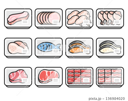 スーパーのパックに入った、鮮魚とお肉のアイコン(線画カラー)のイラストセット