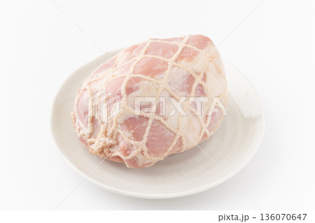 白背景にお皿に載せた紐で巻かれた豚のももハム