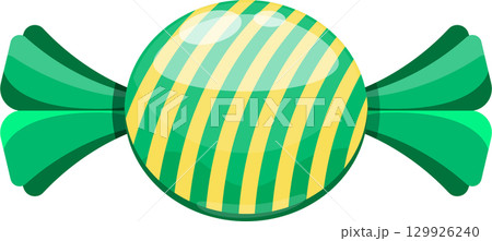 A wrapped candy with yellow and green stripes. The wrapping is green, and the candy is round.