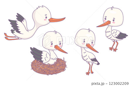 Cute white stork collection. Isolated funny cartoon kawaii bird character in nest, flying and standing. Vector illustration .
