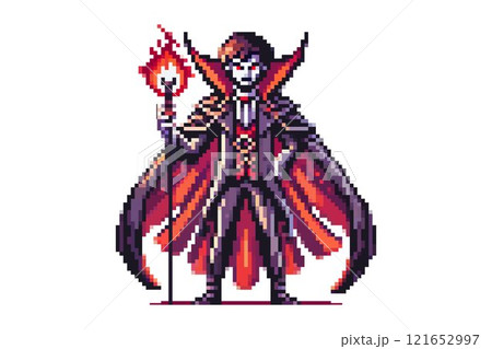 Pixel art depiction of Count Dracula in a dark cloak holding a staff with a fiery orb standing confidently against a white background