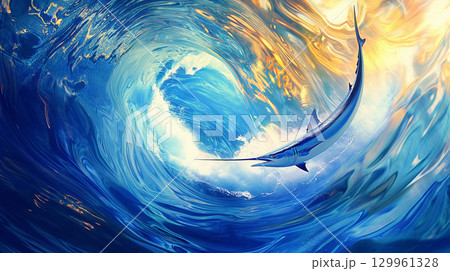 Japanese Wave Art with Sunset and Flowers in Fusion of Ukiyoe Style and Modern Illustration with Generative AI.