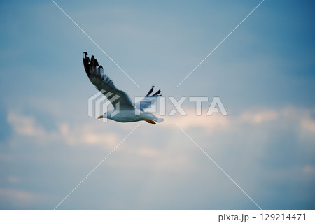 Seagull flies against the sunset sky over the sea. Background travel brochure