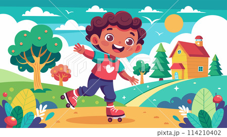 Happy child roller skating in a cartoon landscape with sunny countryside background