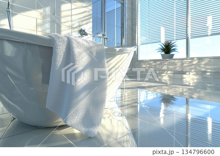 Minimalist bathroom design with freestanding bathtub and natural light, 3D render illustration.