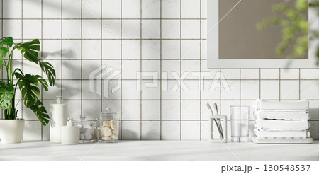 Stylish bathroom countertop with elegant accessories and natural light, 3D render illustration.