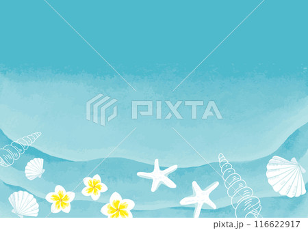 夏の海と波の背景フレーム 癒やし系のシンプル水彩イラスト
