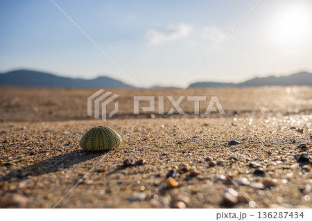 Sea Urchin on Sandy Beach with Soft Focus Mountain Background