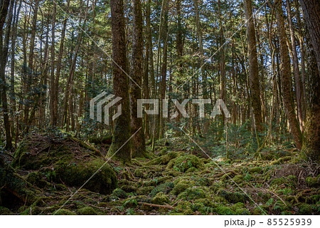 富士山麓に広がる青木ヶ原樹海の木々・神秘的な森の中