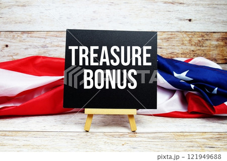 Treasure Bonus text messege with USA flag on wooden background