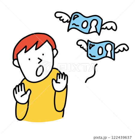 羽が生えて飛んでいくお金に驚く人物のイラスト
