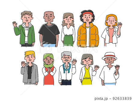 様々な国籍、性別、肌の色の人物 コミカルな手書きの人物 ベクター、温かみのある線画