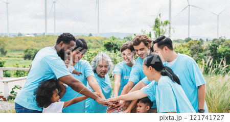 group of people in blue shirts are holding hands in a circle