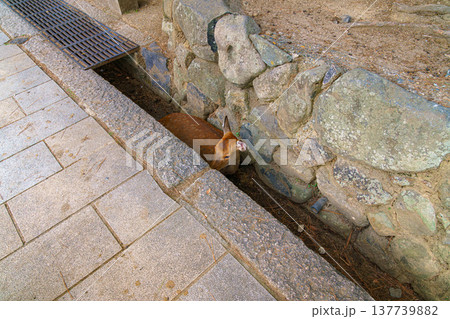 Nara, Japan - Sep 26 2024, Panoramic view of a lone forest deer resting in a drainage gutter running along a cobblestone pedestrian road in Nara Park, at daytime, without people, Nara, Japan