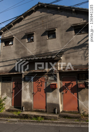 玄関ドアに貧民の落書きがあるアパート・文京区