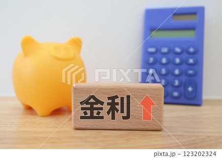 ピンクの豚の貯金箱と利上げの文字