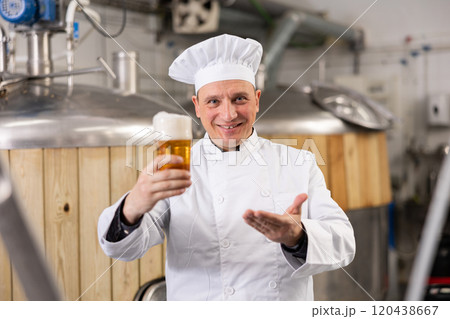 Brewers man and woman is standing with glasses for beer on workplace indoor
