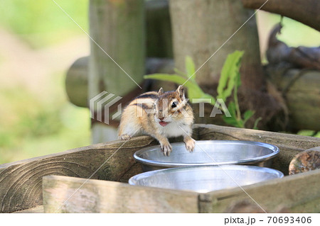 餌鉢の上でエサをほお張るシマリス 大きな頬袋
