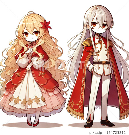AI生成・異世界転生×乙女ゲーム風キャラクター(お嬢様と王子様・赤いドレスと軍服・アニメ風SD)