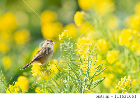 菜の花にとまる野鳥【セッカ】冬毛