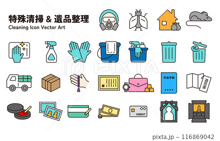 特殊清掃や遺品整理のアイコンイラストセット 塗りあり