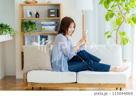スマホを操作する女性 オンライン利用・サービスなどの検索、スマホを見る困る悩む顎に手を当てるポーズ