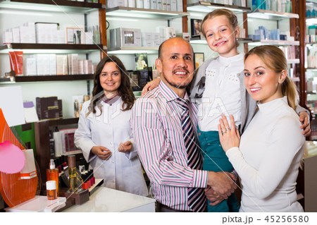 Family with a kid in pharmacy .