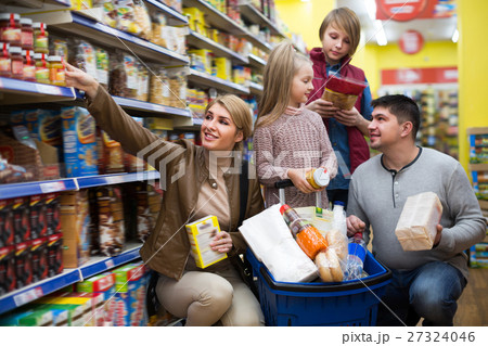 Happy family of four purchasing food together